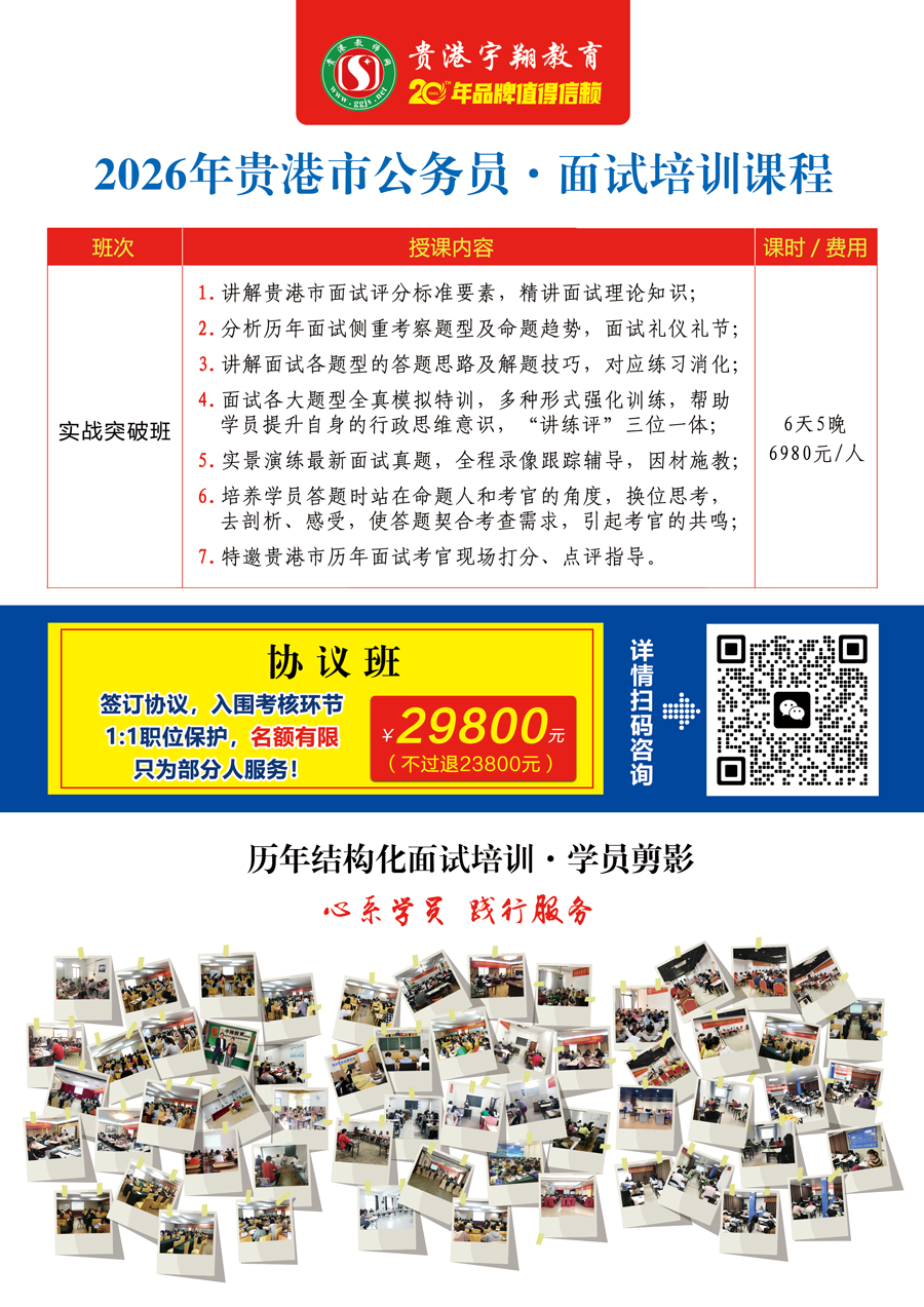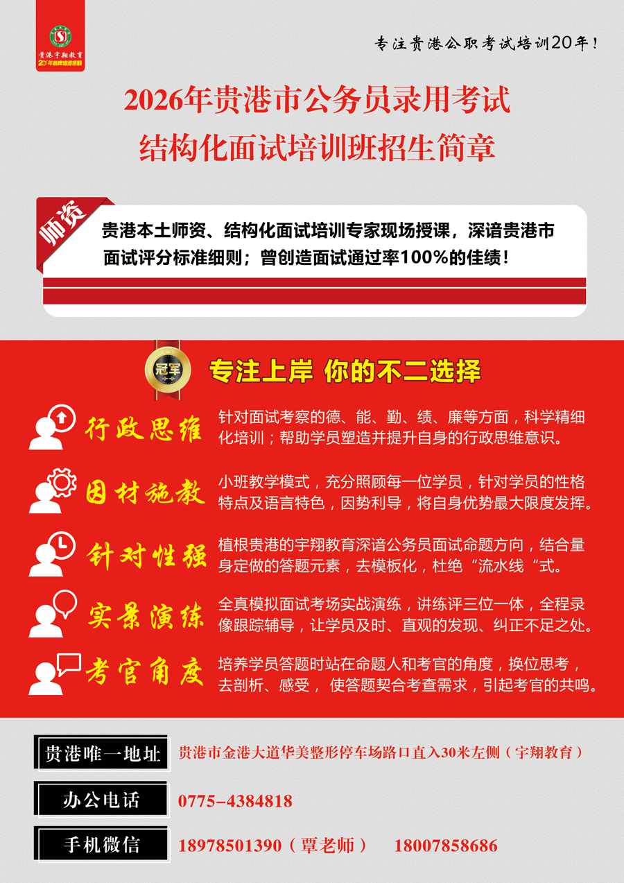 根据贵港市2026年度考试录用公务员公告文件精神,于4月25日组织面试工作,备考时间已不足12天;经办公室研究决定,在4月17日-20日期间开设实战突破班(仅开一期)。全真模拟实战演练突破,帮助学员在答题过程中充分展现出各方面能力,全方位提升学员与岗位之间的匹配度,去模式化答题,拉近与考官的距离。具体培训事宜公布如下: