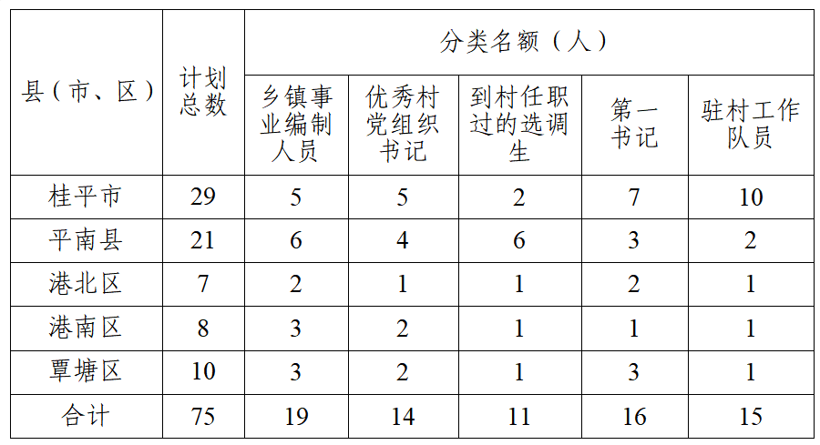 2026年贵港市计划从“五方面人员”中选拔乡镇领导班子成员75名,其中:桂平市29名,平南县21名,港北区7名,港南区8名,覃塘区10名。具体计划如下: